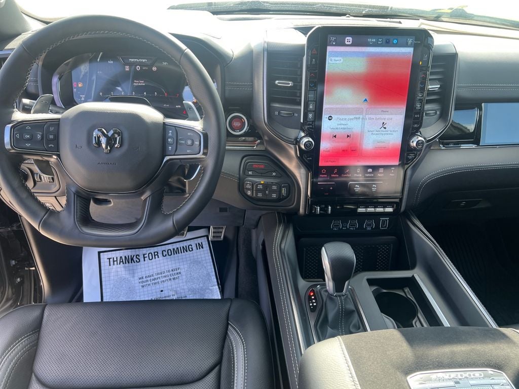 The interior of this Ram 1500 RHO is a true sanctuary, with premium leather-trimmed bucket seats, a luxurious flat-bottom steering wheel, and a wealth of advanced technology features. The 14.4 touchscreen display puts a world of connectivity and entertainment at your fingertips, while the Harman/Kardon premium sound system delivers an unparalleled audio experience.