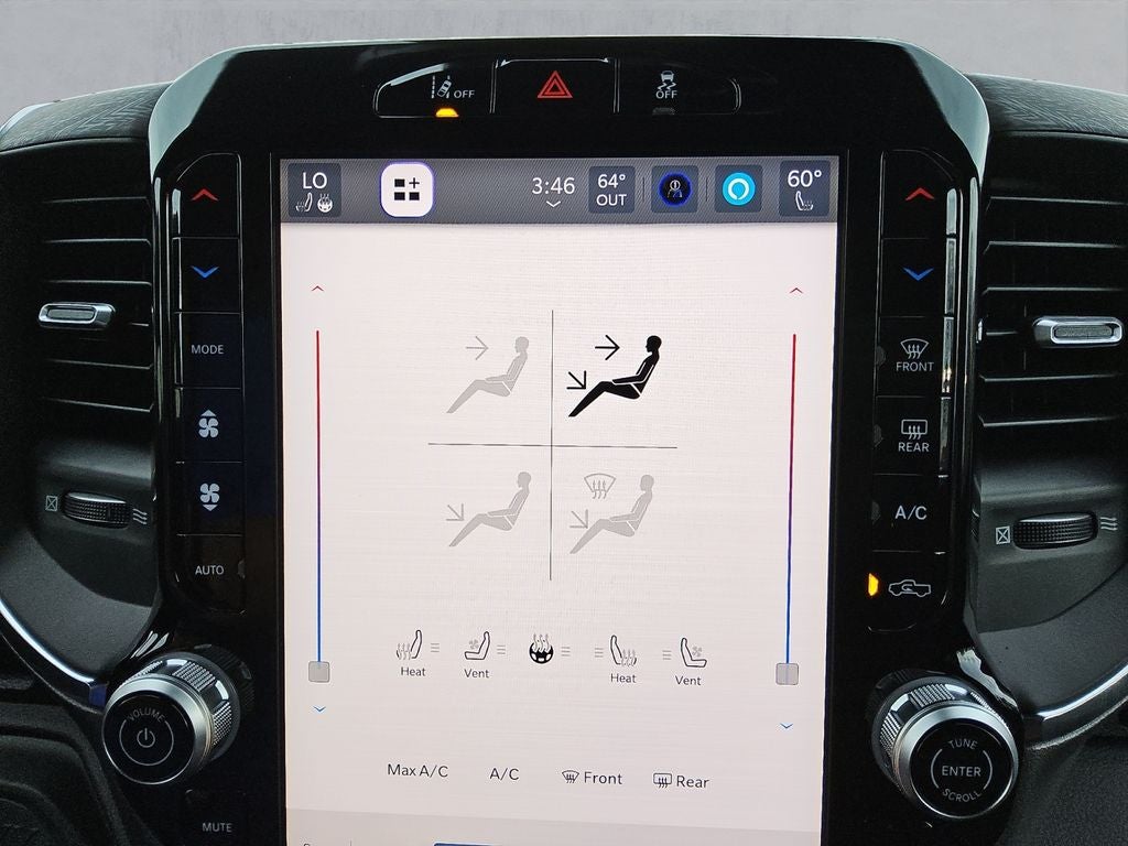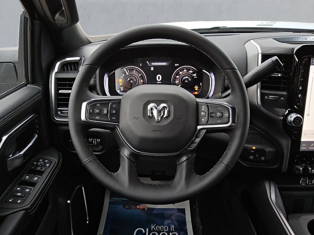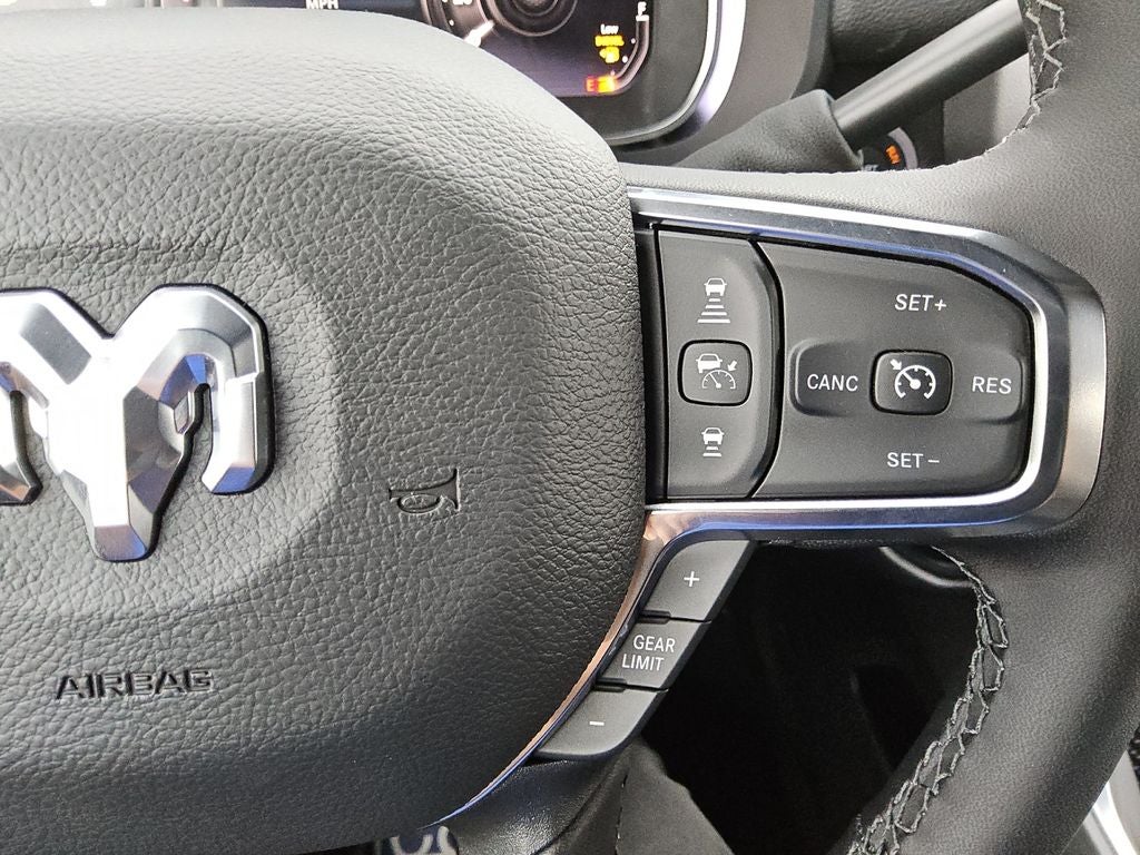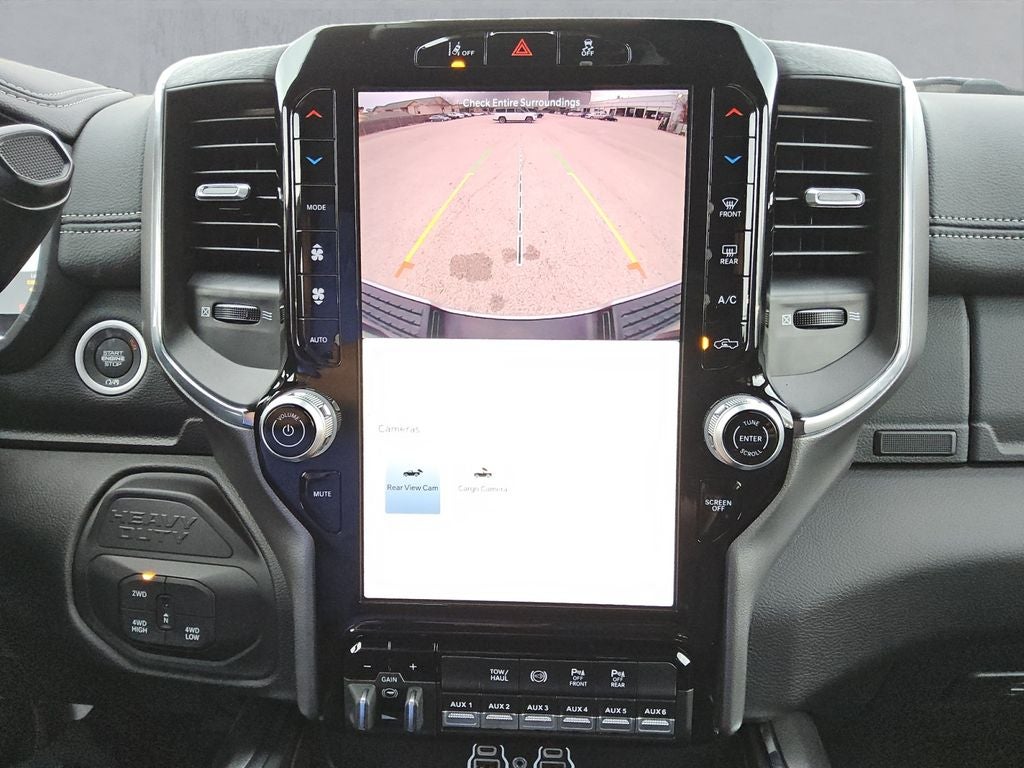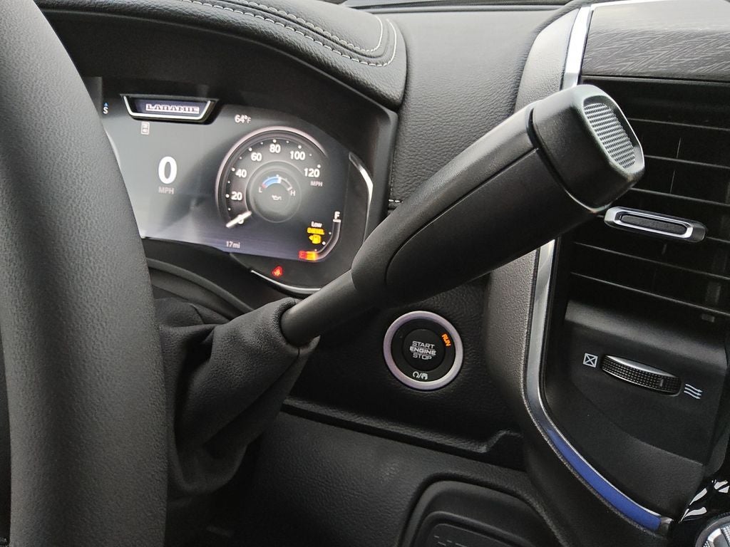 The Night Edition package adds a bold, aggressive presence with its gloss black grille accents, black exterior badging, and 20-inch black painted aluminum wheels. The Laramie Level 1 Plus Equipment Group further enhances the driving experience with features like a center stop lamp with cargo view camera, rain-sensing wipers, and a power-adjustable steering column.